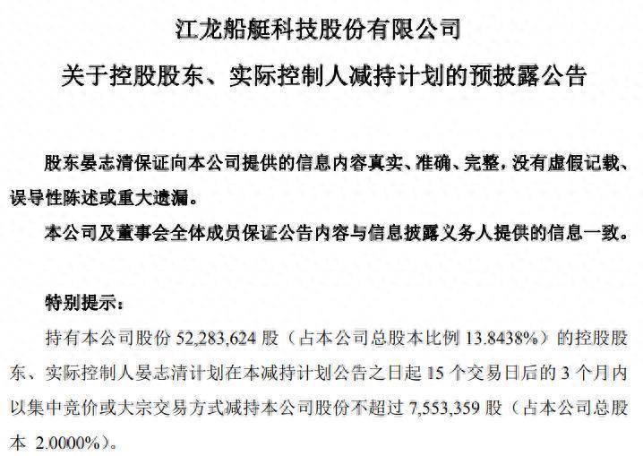11月13日,江龙船艇(300589.SZ)发布公告,持股13.8438%的控股股东、实际控制人晏志清计划在减持计划公告之日起15个交易日后的3个月内以集中竞价或大宗交易方式减持公司股份不超过755.34万股(占公司总股本2%)。